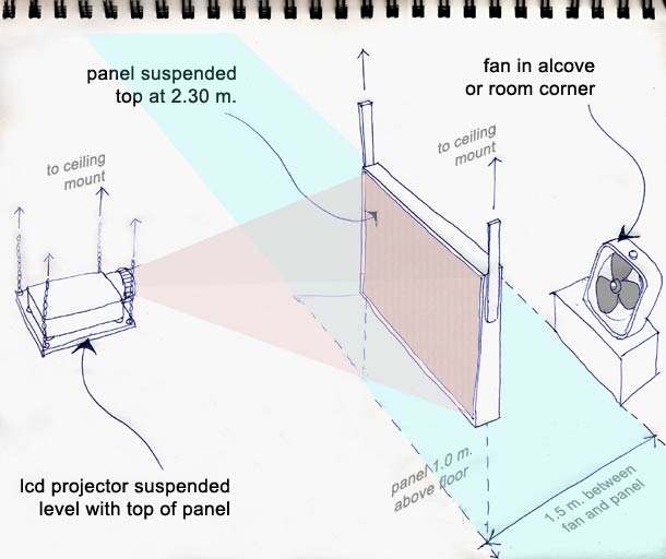 components: 1) FAN: 2 foot diameter variable speed with adjustable angle mounting. 2) SCREEN: 1.40m. wide, 1.10m. tall. Bottom hinged paper "pixels", approx. 400 total. Dupont synthetic paper, 120 gsm. 3) LCD PROJECTOR: minimum1078 X 768 XGA, 1500 lumens, vertical lens shift, keystone correction. Ceiling mounted. 4) PC or MAC: P4 equivalent.