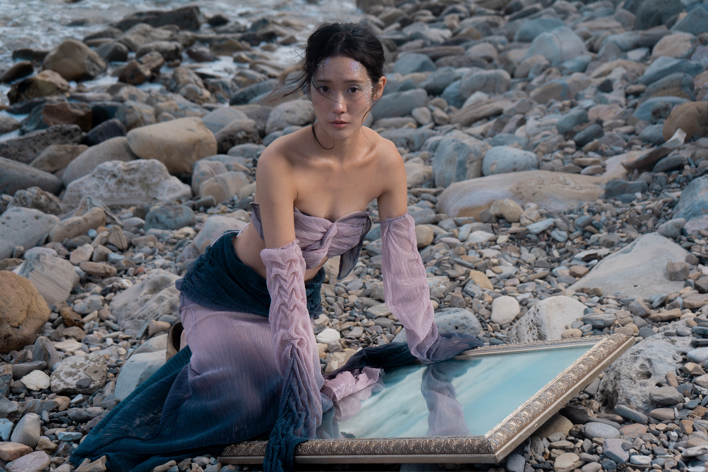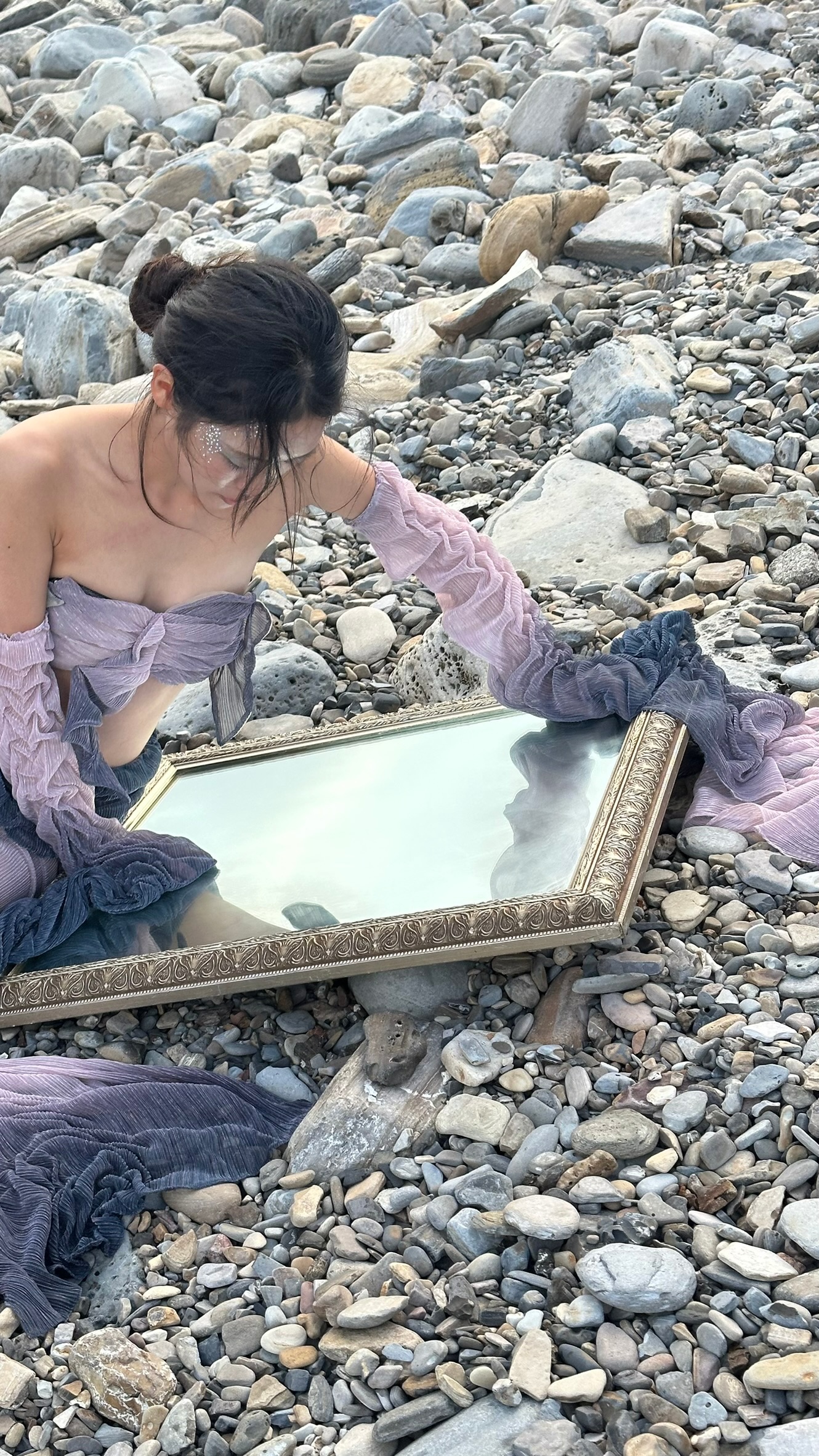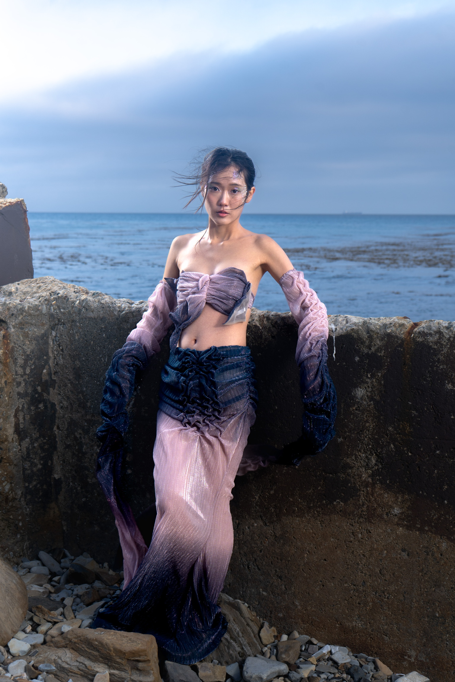 Nereide draws from the mythology of sea nymphs — figures suspended between land and water. The set explores fluidity through draped silhouettes, sheer layering, and gradient textiles that echo the shifting tones of tide and dusk. Quietly embodying the nature of rocky coastlines and the reflective stillness of water, the garment construction intentionally alludes to its transparency.